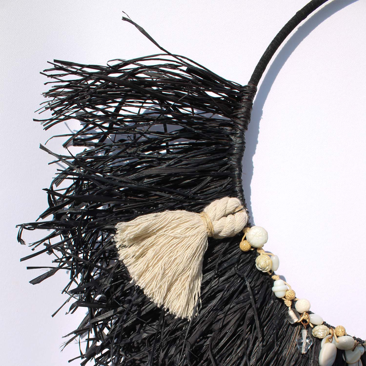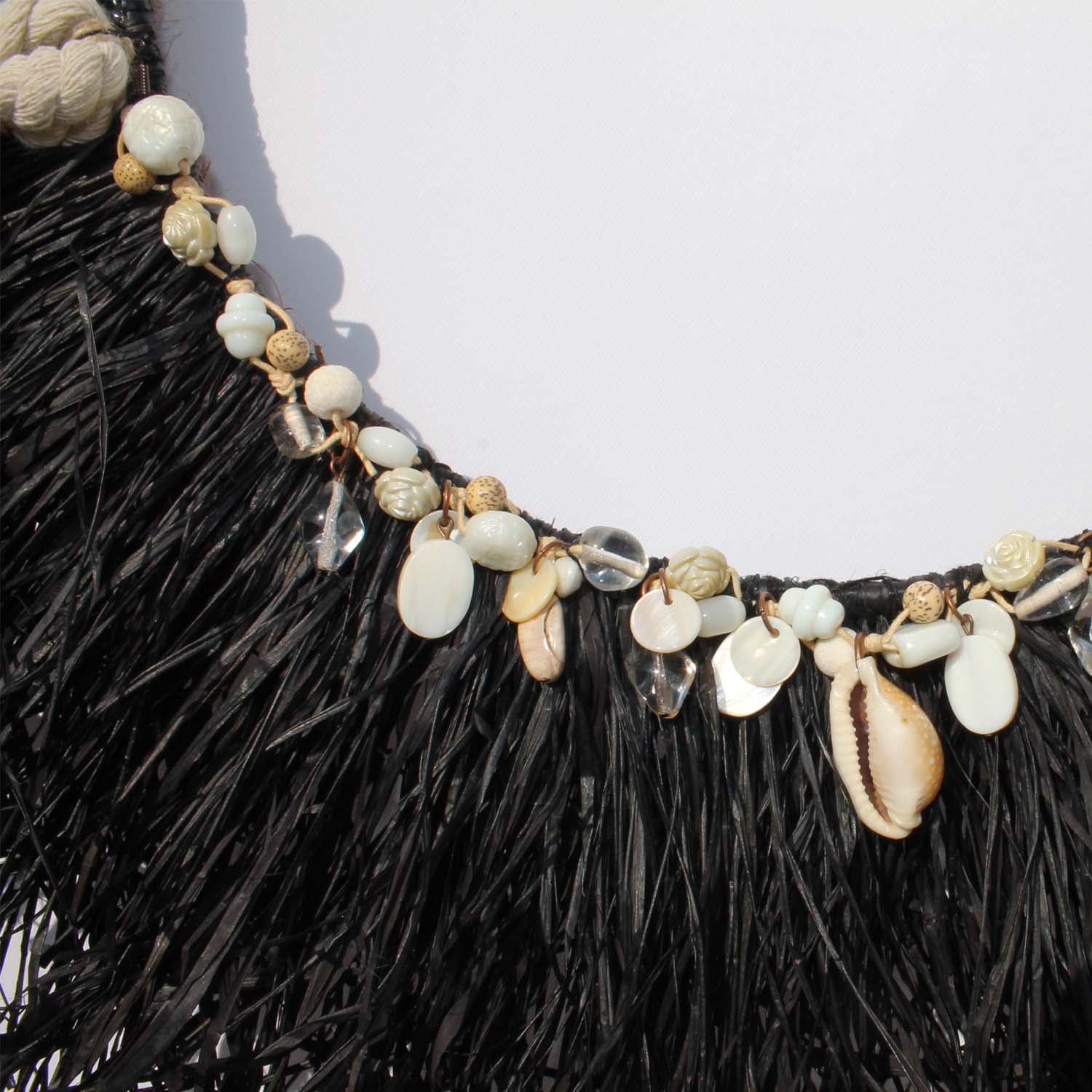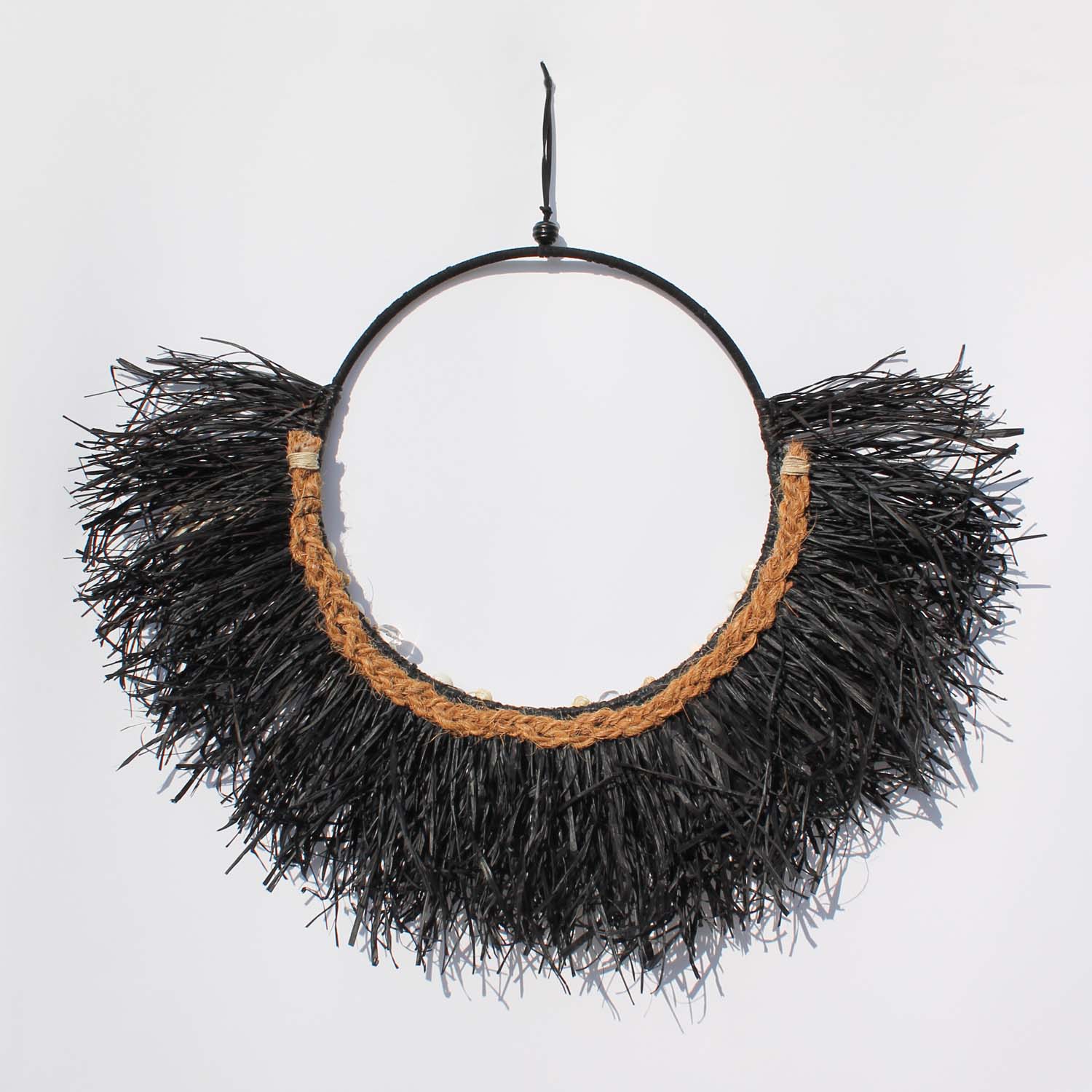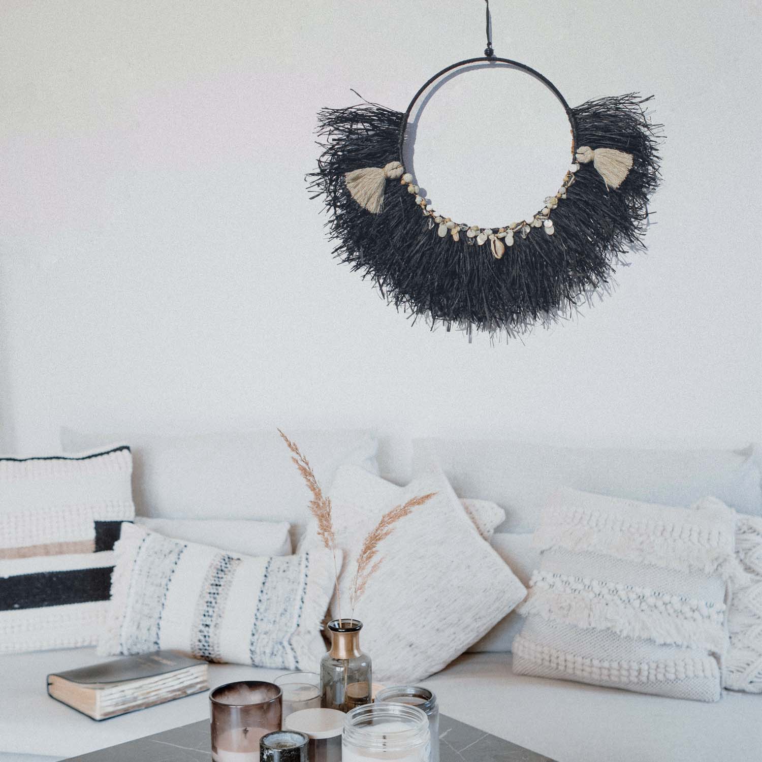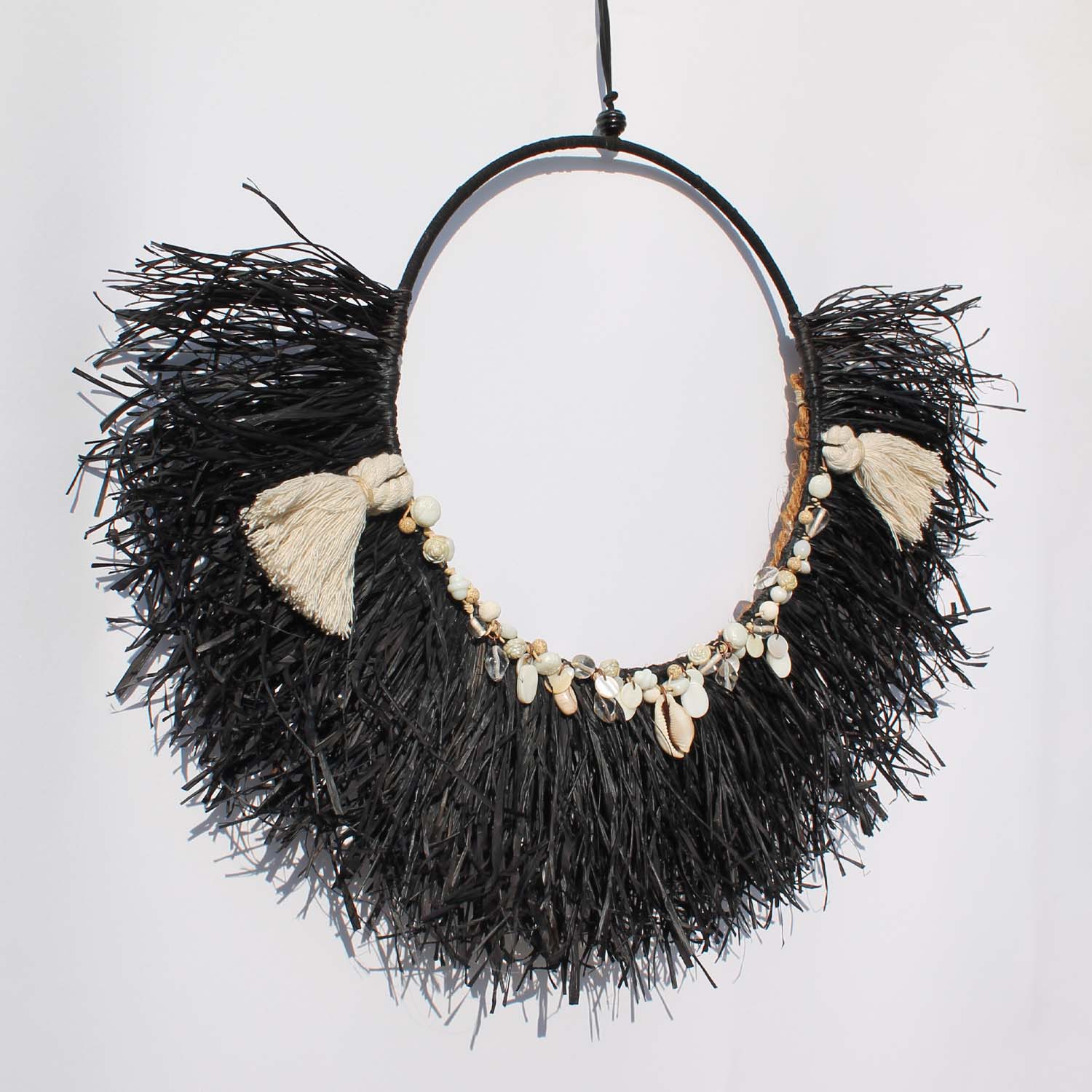 Add a touch of Boho elegance to your space with this unique wall decoration in black and white. Clean shapes meet playful accents – the black natural raffia in a half-round shape is complemented by an intricately knotted seashell chain and cotton tassels. This stylish wall decor makes a real statement, especially on light-colored walls. Perfect for those who appreciate natural materials and a modern yet playful look.