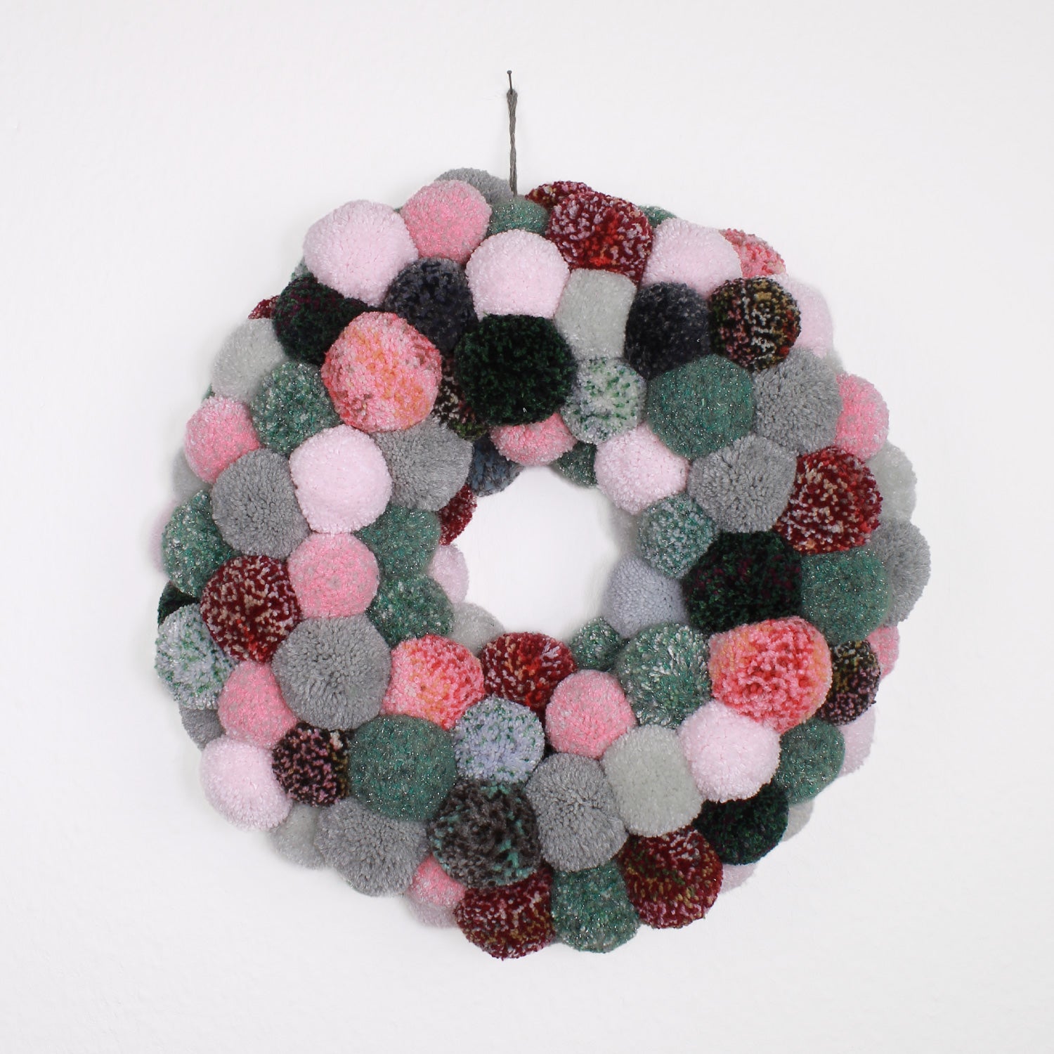 Add a cozy and stylish touch to your space with this extravagant pom-pom wreath! This unique wall decoration is made of 96 large, soft pom-poms in soft pastel colors, carefully sewn by hand onto a wreath. The wreath, crafted from wool and wool blends, is the perfect eye-catching piece for any room – whether it's the living room, bedroom, or nursery. The harmonious colors of gray, pink, and green complement various interior styles and bring a fresh breeze into your home.