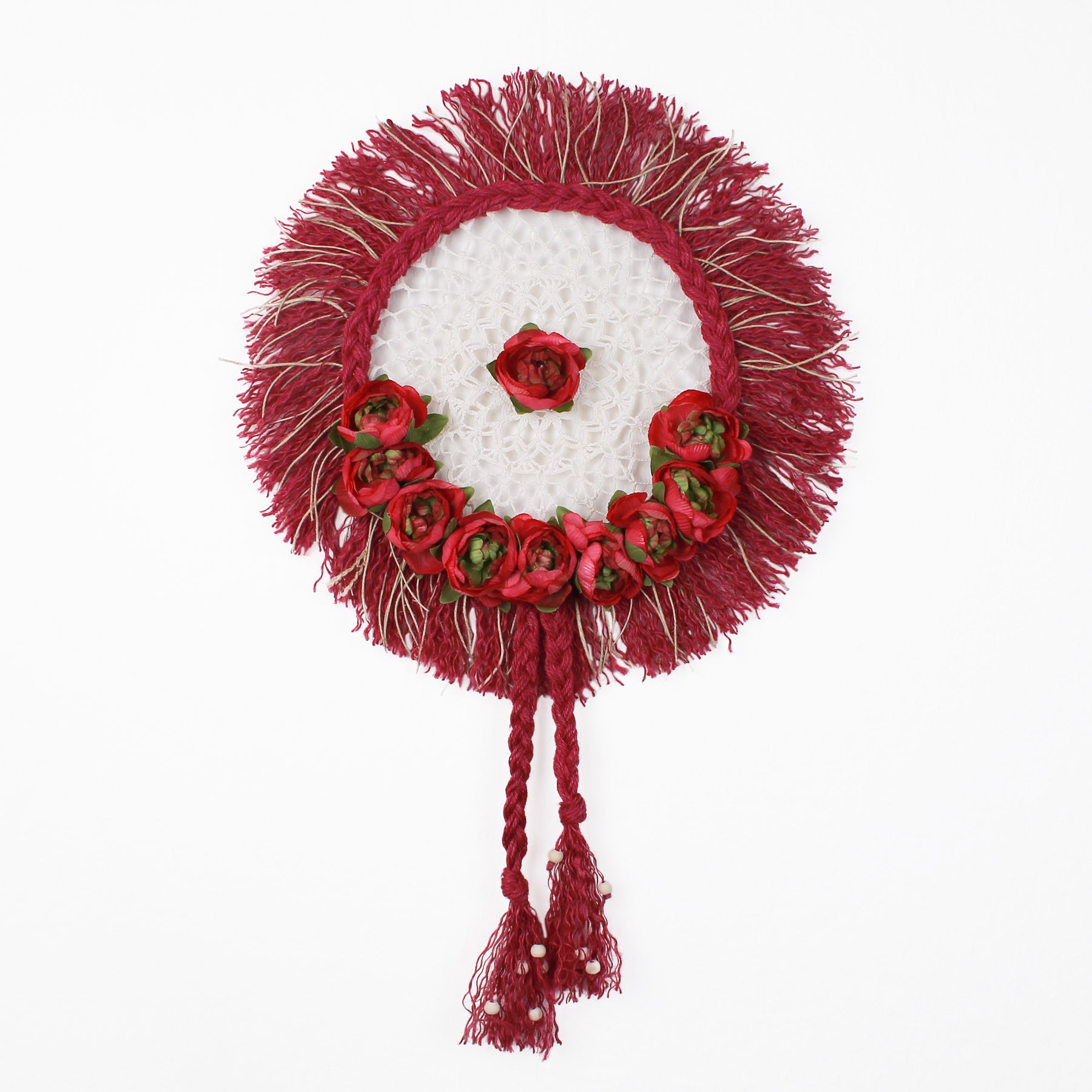 This striking red Boho wall hanging brings a romantic touch to your home décor. With its center featuring a delicate white cotton pattern, surrounded by dark red silk flowers and jute twine, this wall hanging will make a bold statement in any room. Perfect for living rooms, bedrooms, or as a unique gift, it adds warmth and style to your space. The jute hanger, embellished with small wooden beads, complements the natural boho style.