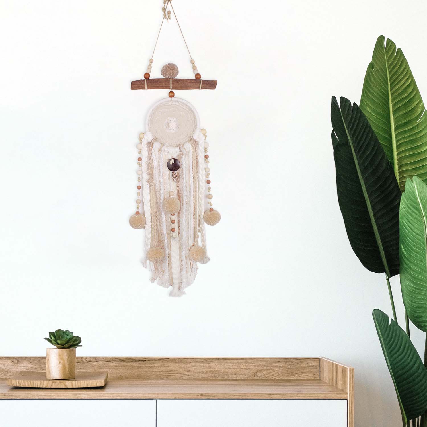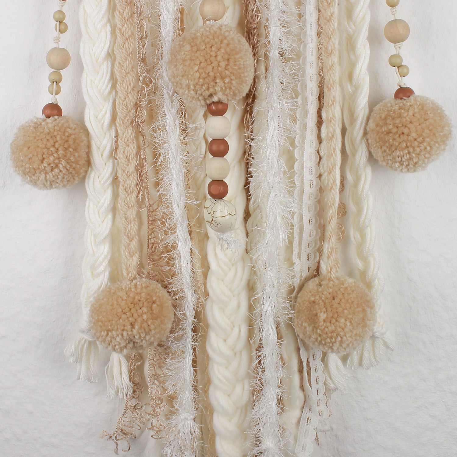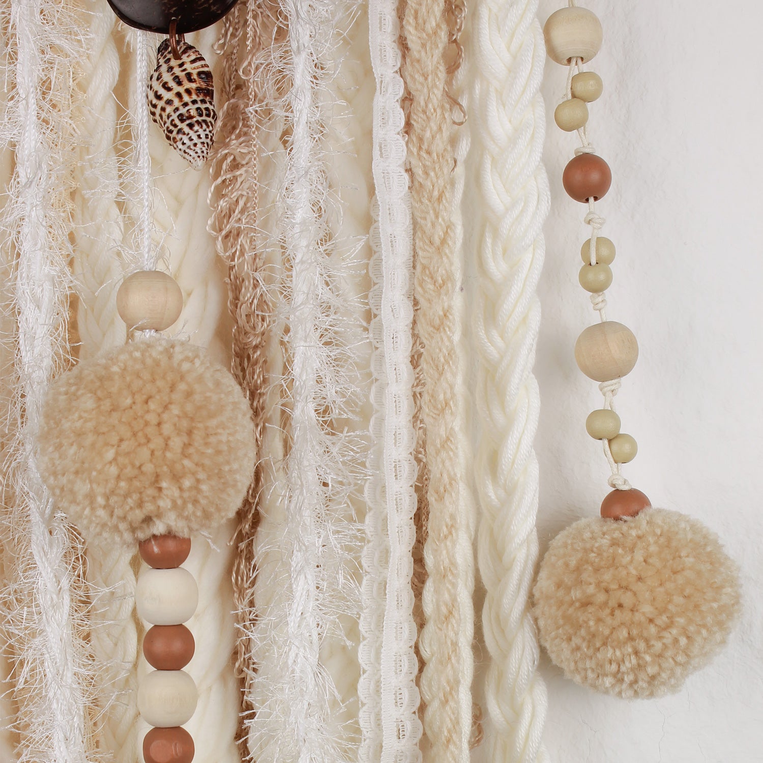 This charming piece captivates with its intricate details and exquisite craftsmanship. Its compact size makes it the perfect decoration for even the smallest wall spaces. Neutral, natural tones ensure it complements any interior style effortlessly. At its center, a delicately crafted ring showcases a resin turtle, while braided chains of wooden beads, wool pom-poms, and various ribbons complete this unique creation.