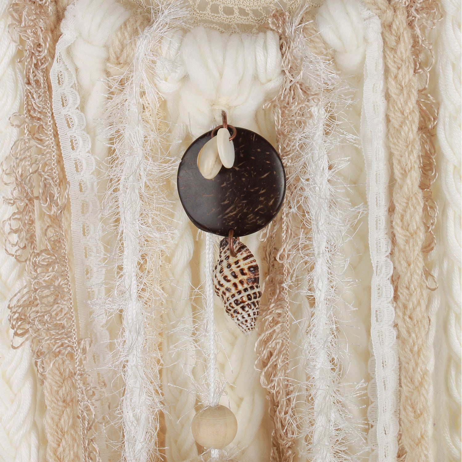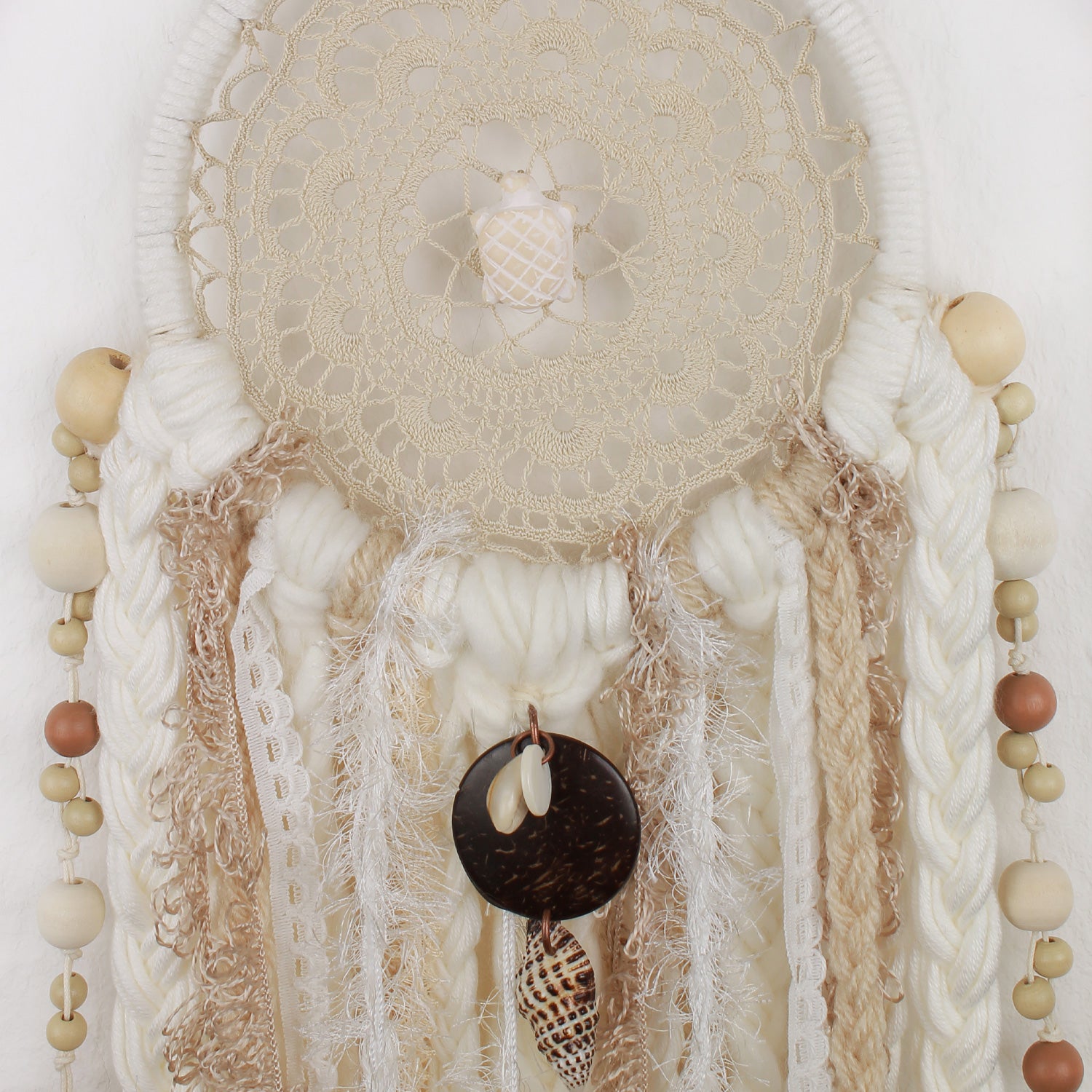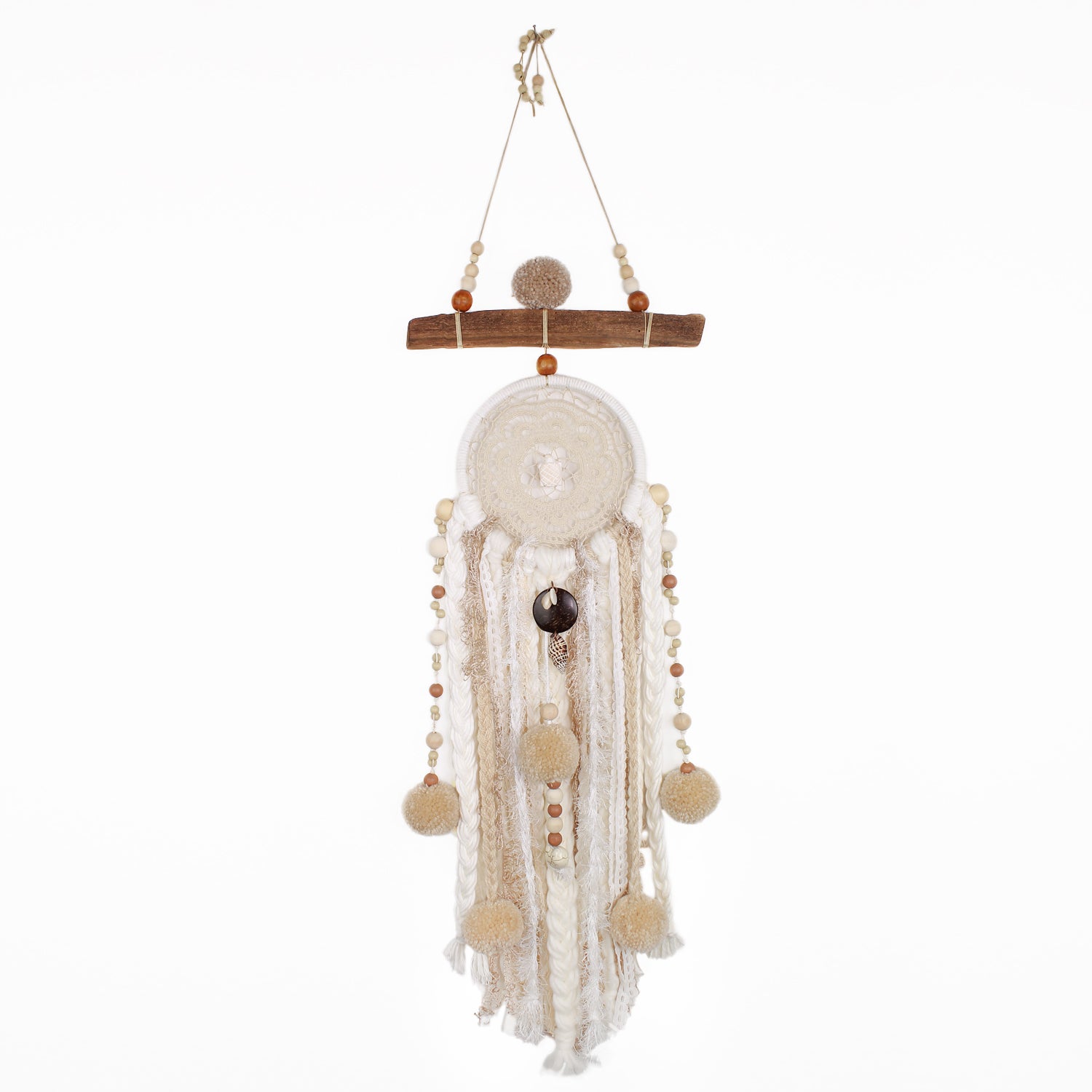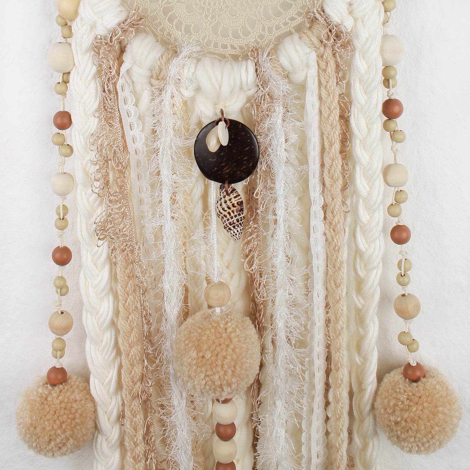This charming piece captivates with its intricate details and exquisite craftsmanship. Its compact size makes it the perfect decoration for even the smallest wall spaces. Neutral, natural tones ensure it complements any interior style effortlessly. At its center, a delicately crafted ring showcases a resin turtle, while braided chains of wooden beads, wool pom-poms, and various ribbons complete this unique creation.